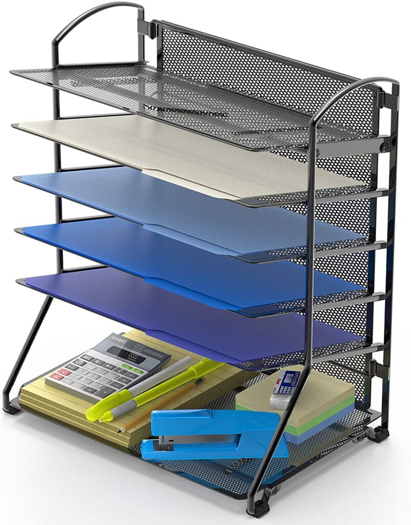- Desktop Organizer: I like to assign one rack for each class as I print all of my lectures and PowerPoints to take notes on during my synchronous classes. This organizer keeps stress low by not having to worry about misplacing notes. Also, it’s kind of satisfying to place a paper in its designated place after you’ve finished it!